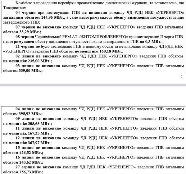 «За результатами проведених спільних заходів Держенергонагляду та НЕК «Укренерго» щодо перевірок введення операторами систем розподілу протиаварійних заходів встановлено, що протягом червня та липня 2024 року оператори систем розподілу АТ «ДТЕК Дніпровські електромережі», ПРАТ «Рівнеобленерго» та АТ «Житомиробленерго» не дотримувалися в повному обсязі встановленого нормативно-правовими актами з питань електроенергетики порядку застосування протиаварійних заходів з припинення постачання електричної енергії споживачам, що вводиться оперативними командами НЕК «Укренерго». Такі дії впливають на справедливе застосування графіків погодинного відключення до споживачів електричної енергії, що у свою чергу призводить до зростання соціальної напруги серед населення України та такі дії АТ «ДТЕК Дніпровські електромережі», ПРАТ «Рівнеобленерго» та АТ «Житомиробленерго» можуть свідчити про порушення операторами систем розподілу вимог нормативно-правових актів, що регулюють функціонування ринку електричної енергії, та Ліцензійних умов з розподілу електричної енергії», - зазначалося у листі «Укренерго».