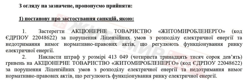 За виявлені порушення АТ «Житомиробленерго» пропонується винести застереження та накласти штраф у розмірі 413 тис. 049 грн.