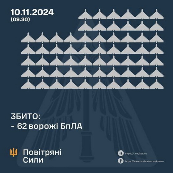 В ніч на 10 листопада над Україною збили 62 ворожих БпЛА.