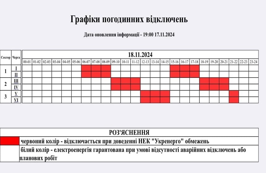 Зауважимо, що АТ «Житомиробленерго» увечері 17 листопада оприлюднило графіки погодинних відключень у Житомирській області.