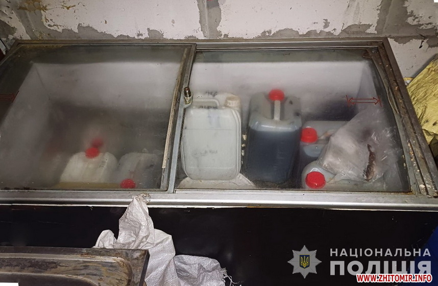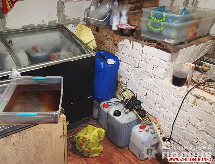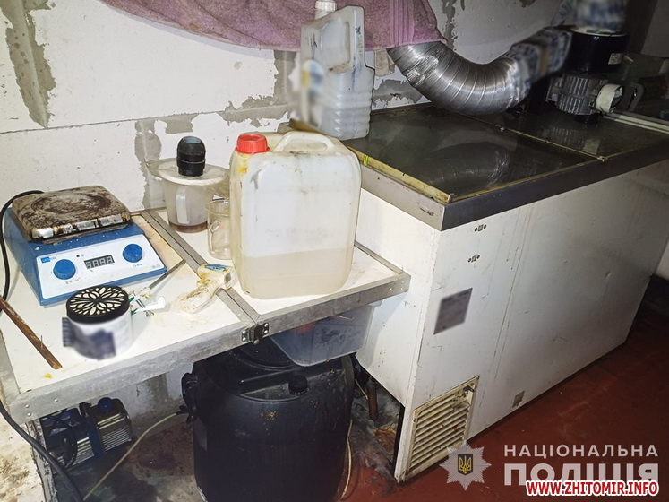 Працівники слідчо-оперативної групи відділення поліції №1 (Малин) Коростенського райуправління провели огляд домогосподарства. Правоохоронці виявили вже готову «продукцію», попередньо – психотропної речовини. Крім того, вилучили майже 500 л рідин, що використовувалися для виготовлення наркотичних засобів (прекурсорів), спеціальне обладнання для виробництва, засоби зв’язку та інші речові докази незаконної діяльності.