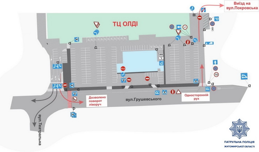 «Завтра, 19 листопада, запроваджуються зміни в організації дорожнього руху на вулиці Михайла Грушевського. У зв'язку з численними скаргами та частими порушеннями ПДР на ділянці вулично-шляхової мережі на перехресті вулиць Михайла Грушевського та Театральної (виїзд від ТЦ), управлінням патрульної поліції в Житомирській області ініційовано та внесено зміни до організації дорожнього руху на вказаному перехресті. Відділом безпеки дорожнього руху вжито ряд заходів, зокрема: змінено дорожні знаки та розмітку, для безпечного повороту ліворуч зміщено пішохідний перехід та створено захисний острівець безпеки. Додатково організовано односторонній рух зі встановленням комплексу відповідних дорожніх знаків на проїзді з вулиці Михайла Грушевського біля ТЦ в напрямку вулиці Покровської. Просимо врахувати зазначену інформацію, бути уважними та дотримуватися ПДР», - йдеться у повідомленні.