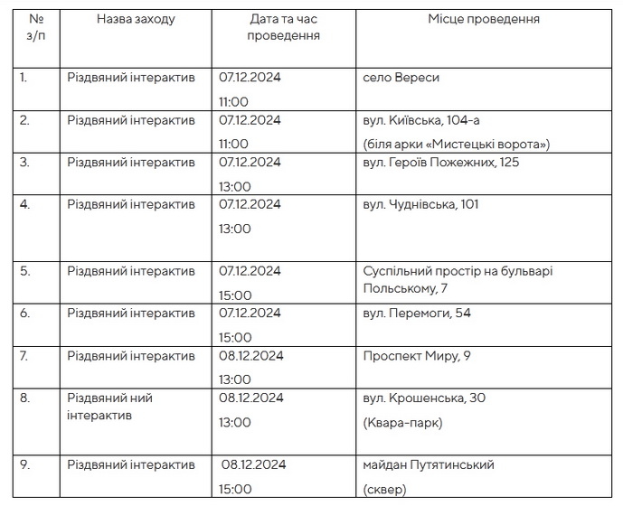 Різдвяні інтерактиви відбуватимуться з 4 до 15 грудня (субота та неділя – вихідні) на таких локаціях: