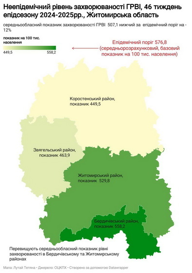 У Житомирській області на 46 тижні спостереження епідсезону 2024/2025 рр. з ГРВІ, в період 11 листопада - 17 листопада 2024 року, спостерігається підвищення рівнів захворюваності в порівнянні з попереднім тижнем на 2%.