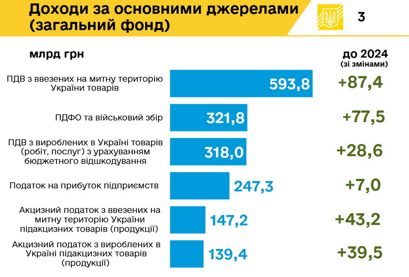 Доходи загального фонду (без врахування грантів та міжнародної допомоги) заплановані на рівні 2,05 трлн грн. Видатки загального фонду передбачені на рівні 3,6 трлн грн.