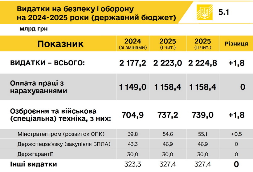 У 2025 році буде спрямовано 26,3% ВВП країни на безпеку та оборону, адже це ключовий пріоритет: видатки зростуть до 2,23 трлн грн, що на 47,6 млрд грн більше порівняно з уточненим планом 2024 року. Це збільшення дозволить посилити обороноздатність країни.