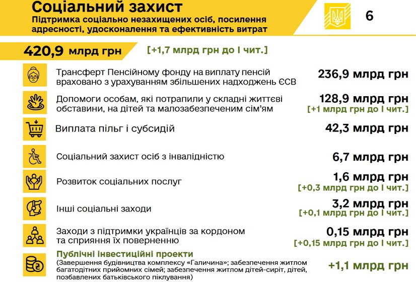 На соціальний захист громадян передбачено 420,9 млрд грн, що охоплює підтримку пенсіонерів (зокрема індексацію пенсій з 1 березня 2025 року), малозабезпечених сімей та осіб з інвалідністю. З них трансферти до Пенсійного фонду складуть 236,9 млрд грн, виплати пільг і субсидій – 42,3 млрд грн, а також додаткові кошти на соціальні програми у рамках публічних інвестицій (PIM) - 1,1 млрд грн, включаючи будівництво житла для багатодітних родин та розвиток соціальних послуг.