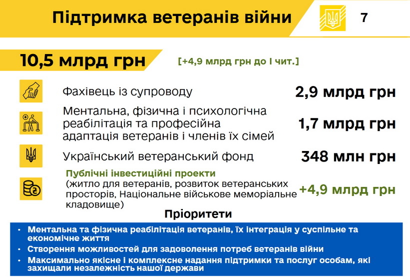На підтримку ветеранів війни у 2025 році передбачено 10,5 млрд грн, з яких 2,9 млрд грн спрямовано на фінансування фахівців із супроводу, 1,7 млрд грн – на ментальну, фізичну та психологічну реабілітацію і професійну адаптацію ветеранів, 348 млн грн – на програми Українського ветеранського фонду. У рамках PIM додатково виділено 4,9 млрд грн на Публічні інвестиційні проекти, включаючи будівництво житла для ветеранів.