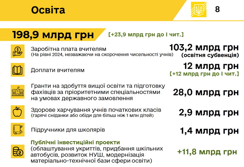 На освіту заплановано спрямувати 198,9 млрд грн. Фінансування покриє видатки на зарплати вчителям у розмірі 103,2 млрд грн, 12 млрд грн на доплати вчителям, закупівлю підручників для школярів (1,4 млрд грн), гранти на вищу освіту – 28 млрд грн. У межах PIM додатково виділено 11,8 млрд грн на модернізацію та покращення матеріально-технічної бази навчальних закладів та облаштування укриттів для безпеки учнів.