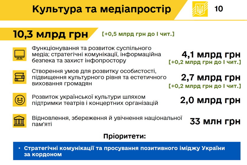 На підтримку культури та медіапростору передбачено 10,3 млрд грн. Фінансування охоплює збереження культурної спадщини, підтримку національних театрів та концертних організацій (2 млрд грн), а також проекти з розвитку стратегічних комунікацій та інформаційної безпеки (4,1 млрд грн).
