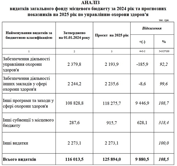 «В цілому по управлінню охорони здоров’я міської ради на 2025 рік заплановані видатки у сумі 127 040,7 тис. грн, у тому числі по загальному фонду – 125 894,0 тис. грн, по спеціальному фонду – 1 146,7 тис.грн», - йдеться у пояснювальній записці.