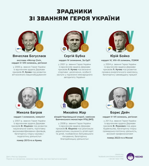 «Президент України Володимир Зеленський підписав указ, яким увів у дію рішення РНБО щодо позбавлення державних нагород зрадників України. До першого списку увійшло 34 особи. Серед них – колишні урядовці, народні депутати, керівники СБУ та Генпрокуратури, прокурори, артисти, російські політичні, релігійні та культурні діячі. Усіх їх позбавлено державних нагород України безстроково», - йдеться в повідомленні.