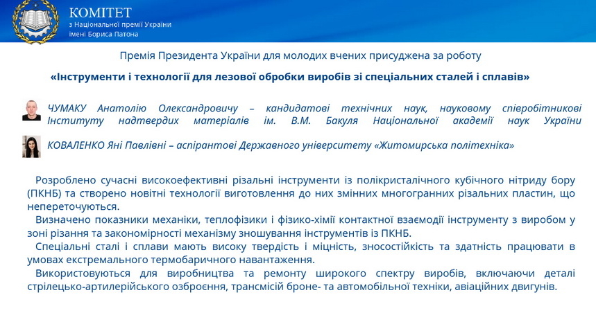 В указі, зокрема, зазначається, що за роботу «Інструменти і технології для лезової обробки виробів зі спеціальних сталей і сплавів» премії присуджені: