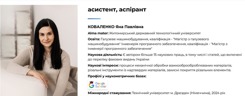 КОВАЛЕНКО Яні Павлівні – аспірантові Державного університету «Житомирська політехніка».