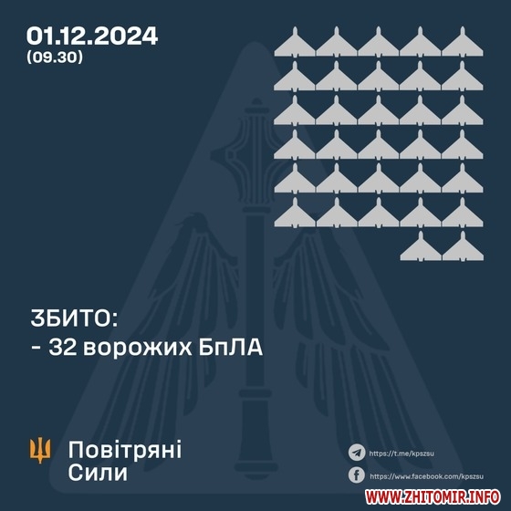 Збито 32 ворожих БпЛА. У ніч на 1 грудня 2024 року (із 20.00 30 листопада) із напрямків Курськ, Орел, Брянськ - рф. ворог атакував 78 ударними БпЛА типу «Shahed» та безпілотниками невстановленого типу.