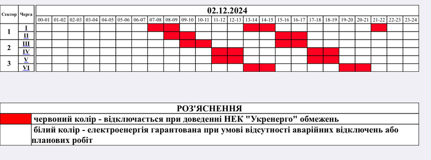 Завтра, 2 грудня, згідно з розпорядженням НЕК «Укренерго», час застосування і обсяг обмежень на Житомирщині будуть такими: