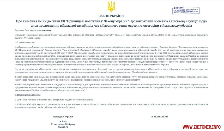 Довідково: Верховна Рада України проголосувала за цей закон 21 листопада. Він передбачає, для військових, які самовільно залишили місце служби до 29 листопада 2024 року, але потім добровільно повернулися до 01 січня 2025 року назад й виявили бажання боронити Батьківщину від російського агресора, військова служба і дія контракту продовжується. Основна мета Закону – створити можливості для військовослужбовців, які самовільно залишили військові частини чи місця проходження служби або дезертували до 29 листопада 2024 року повернутися до 01 січня 2025 року в частини та продовжити службу без докорів сумління та конфліктів із законодавством України.
