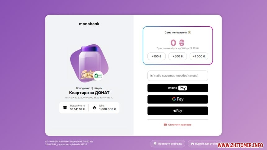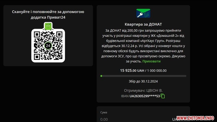 «Звертаємо вашу увагу, якщо ви плануєте брати участь у розіграші квартири, просимо направляти свої донати з ПриватБанку на рахунок ПриватБанку, з monobank на рахунок monobank. Це технічна особливість. Для того, щоб в момент розіграшу ми могли вас ідентифікувати та оголосити переможцем. За бажання, у день розіграшу переможець зможе оформити право власності на свою новеньку квартиру», – пояснює начальник відділу продажів Володимир Цвіон.