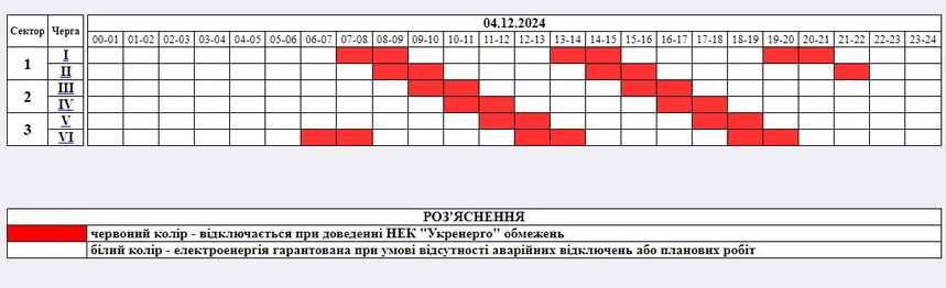 Завтра, 4 грудня, згідно з розпорядженням НЕК «Укренерго», час застосування і обсяг обмежень на Житомирщині будуть такими: