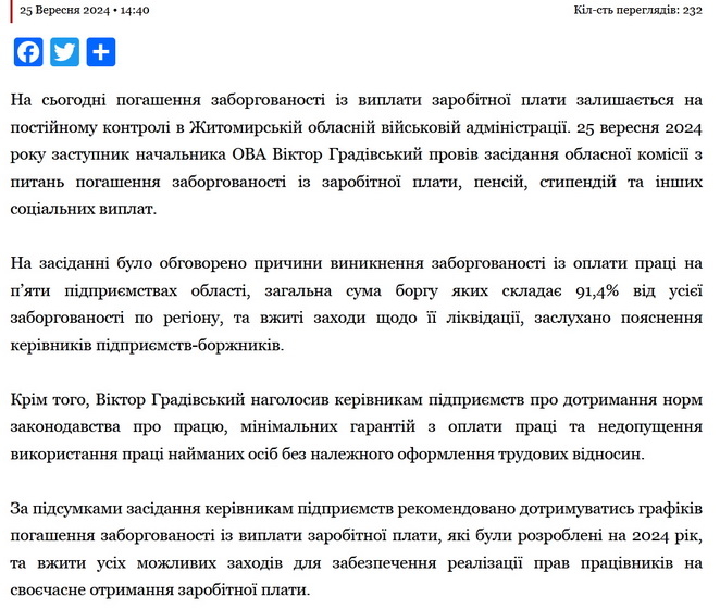 Зауважимо, що на сайті Житомирської ОВА періодично публікуються звіти про засідання обласної комісії з питань погашення заборгованості із заробітної плати, пенсій, стипендій та інших соціальних виплат, але інформація про загальну суму боргу та найбільших боржників там відсутня.