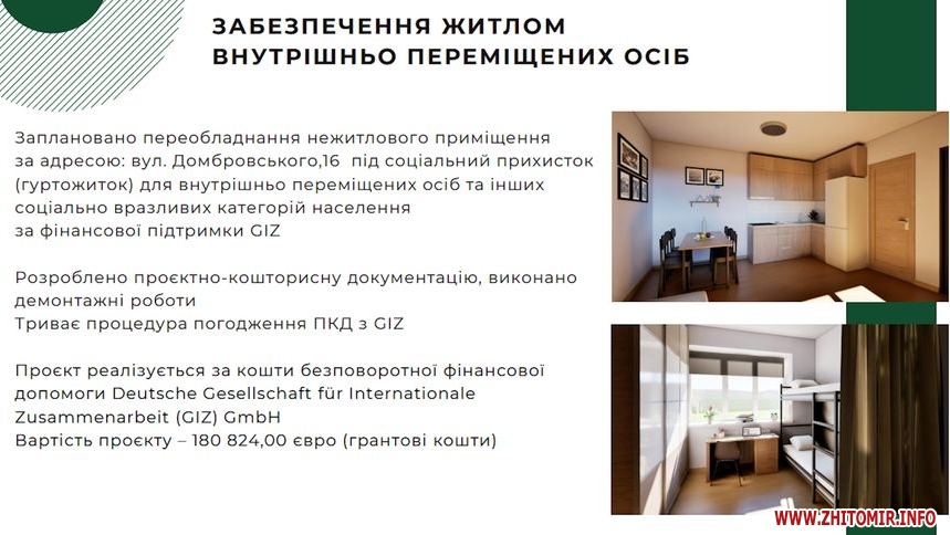 «В активній фазі реалізація проєкту з нового будівництва житлового багатоквартирного комплексу, призначеного для проживання ВПО. Він складатиметься з чотирьох багатоквартирних будинків. У кожному з них – чотири поверхи. В наступному році заплановано завершення робіт з переобладнання нежитлового приміщення за адресою вул. Домбровського, 16», – говорить директорка департаменту економічного розвитку Житомирської міської ради Вікторія Сичова.