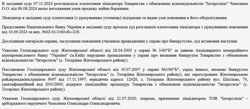 Дозвіл на аукціон з продажу майнових активів ТОВ «Інтерстиль» наданий ухвалою Господарського суду Житомирської області від 7 листопада 2024 року у справі про банкрутство, яка розглядається в судах з 2005 року.