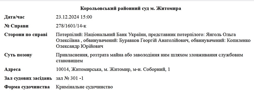 З квітня 2014 року справа перебуває на розгляді у Корольовському районному суді м.Житомира, чергове засідання призначене на 23 грудня 2024 року.