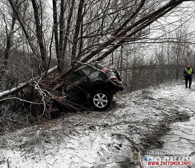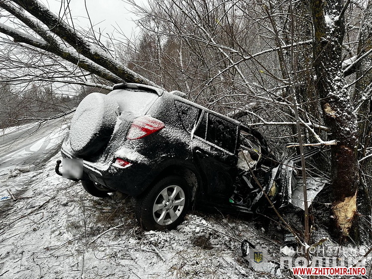 «Дорожньо-транспортна пригода сталася 10 грудня близько 6:00 у с. Нянівці. На місці події працювала слідчо-оперативна група відділення поліції №1 (Малин) Коростенського райуправління. Попередньо встановлено, що 46-річний водій автомобіля «Toyota RAV4», рухаючись у напрямку с. Жабоч, не впорався з керуванням, з’їхав у кювет та здійснив наїзд на дерево», - йдеться в повідомленні.
