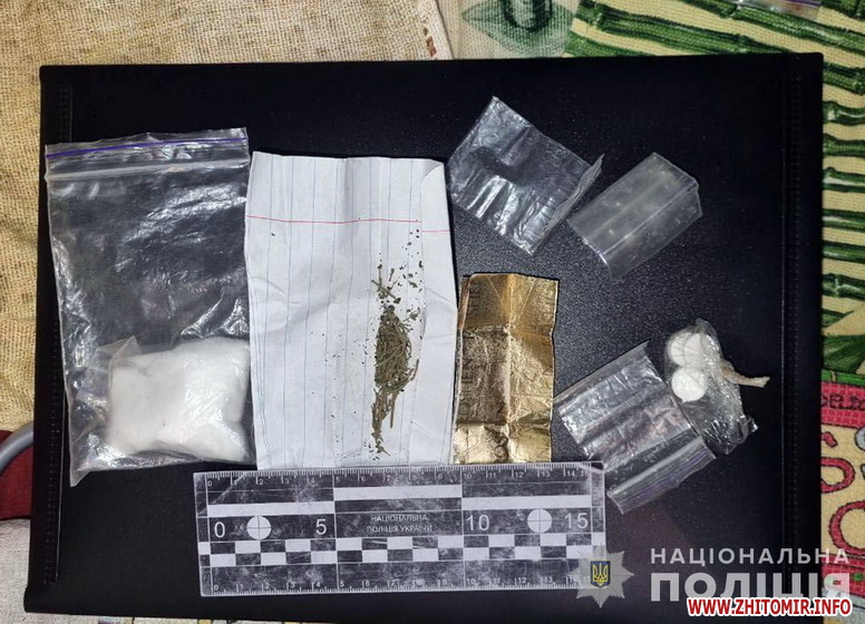 Слідчі Житомирського райуправління поліції інкримінували чоловікові вчинення кримінальних правопорушень, передбачених ч. 2 ст. 307 (Незаконне виробництво, виготовлення, придбання, зберігання, перевезення, пересилання чи збут наркотичних засобів, психотропних речовин або їх аналогів) та ч. 1 ст. 309 (Незаконне виробництво, виготовлення, придбання, зберігання, перевезення чи пересилання наркотичних засобів, психотропних речовин або їх аналогів без мети збуту) КК України. Також триває робота щодо перекриття каналів постачання наркотиків до обласного центру.