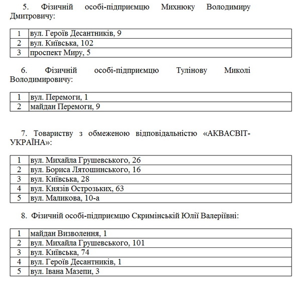У додатку – перелік суб'єктів господарювання та 209 адрес розміщення автоматів з продажу питної води. Найбільше точок продажу мають чотири підприємці:
