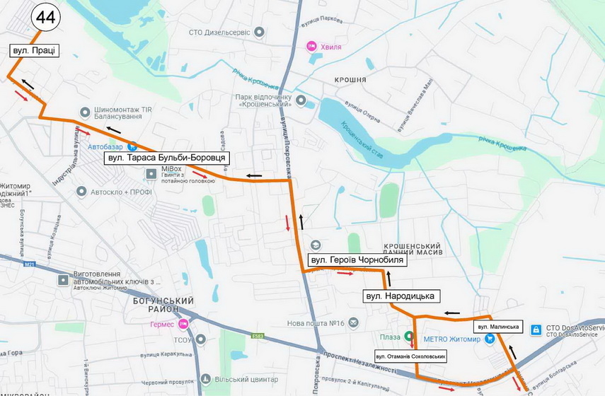 Міський автобусний маршрут № 44 буде продовжений з ринку «Малинський» до вул. Праці згідно з наступною схемою: мМіське кладовище - шосе Західне – вул. Чуднівська – майдан Соборний – вул. Велика Бердичівська – вул. Селецька – вул. Вітрука – вул. Шевченка – вул. Івана Сльоти – вул. Бориса Тена – вул. Східна – вул. Малинська - вул. Народицька (вул. Отаманів Соколовських – просп. Незалежності) – вул. Героїв Чорнобиля – вул. Покровська – Тараса Бульби-Боровця – вул. Бялика – вул. Праці.»
