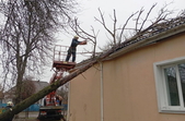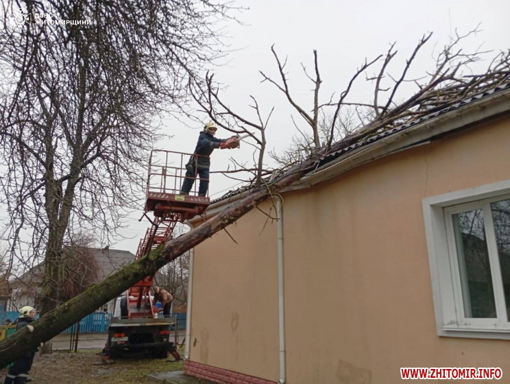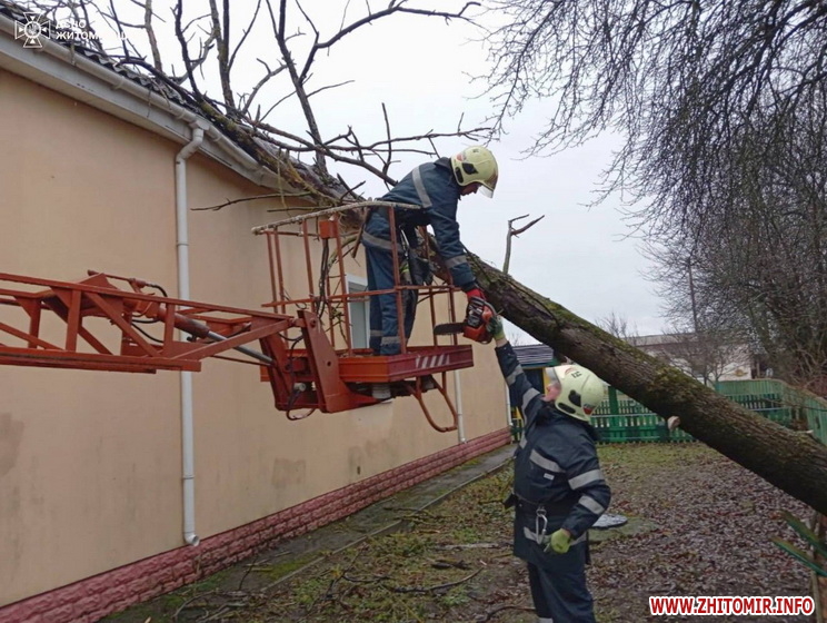 «17 грудня о 10:07 до Служби порятунку «101» надійшло повідомлення про те, що в смт Народичі Коростенського району на дах дитячого садка «Сонечко» впало дерево. На місці події стало відомо, що через сильні пориви вітру на дах будівлі, критий черепицею, впало дерево. У зазначеній будівлі діти не перебували. Бійці ДСНС бензорізом відрізали частину забору. Після чого рятувальники за допомогою бензопили на даху розрізали дерево та багром стягнули донизу», - йдеться в повідомленні.