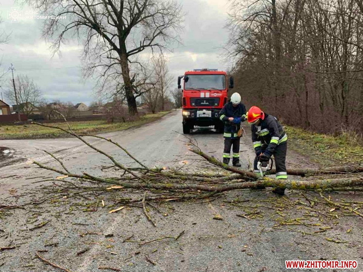 Також упродовж доби подібні аварійні роботи проводилися бійцями ДСНС поблизу сіл Громада та Високе Житомирського району, де через пориви вітру на проїжджу частину дороги впали дерева, чим заблокували рух автівкам. Загалом за добу було прибрано три повалених негодою дерева.