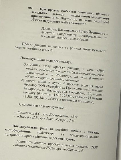 Як повідомляв Житомир.info, на черговій сесії Житомирської міської ради 11 квітня 2024 року депутати погодили продаж 12 земельних ділянок несільськогосподарського призначення, на яких розміщені об’єкти нерухомого майна заявників.