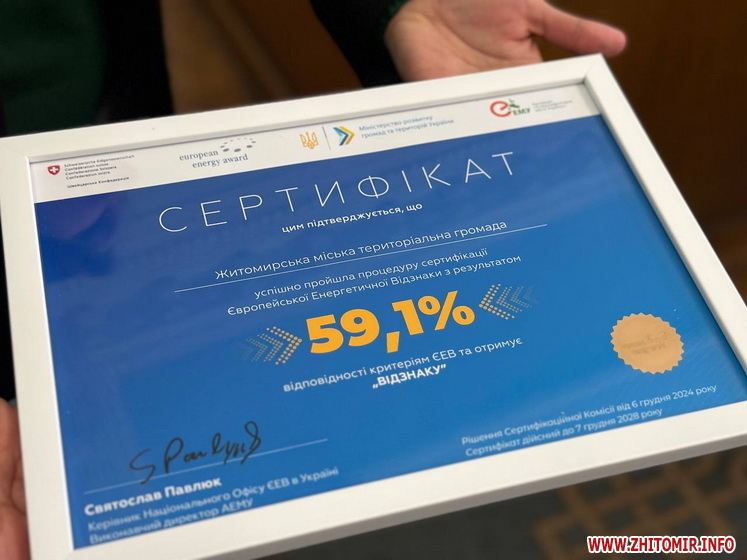 Довідка Житомирської міської ради: З 2016 року Житомир співпрацює з Державним секретаріатом з економічних питань Швейцарської Конфедерації (SECO) у межах впровадження системи управління якістю ЄЕВ. Програма спрямована на допомогу муніципалітетам у плануванні та реалізації ефективних енергетичних і кліматичних заходів. У 2019 році, після проведення міжнародного аудиту, Житомир вперше отримав сертифікат ЄЕВ із результатом 56,1 бала. Протягом наступних років місто продовжувало активно працювати над покращенням своїх підходів до енергозбереження. У 2023-2024 роках Житомир пройшов другу сертифікацію за період 2019-2022 років. За результатами аудиту та засідання Комісії з сертифікації ЄЕВ Житомир підтвердив відповідність вимогам із результатом 59,1 бала, що перевищило попередній показник.