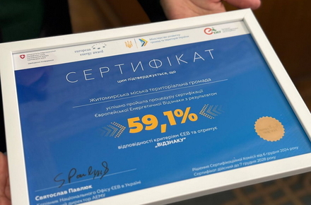 Нагадаємо, 19 березня 2019 року Житомир другим серед українських міст отримав Європейську енергетичну відзнаку, вручив її координатор Міжнародного офісу Європейської енергетичної відзнаки Паскаль Штайнгрубер під час зустрічі Муніципальної координаційної платформи з розвитку «Енергетична та кліматична трансформація для підписантів Угоди мерів».