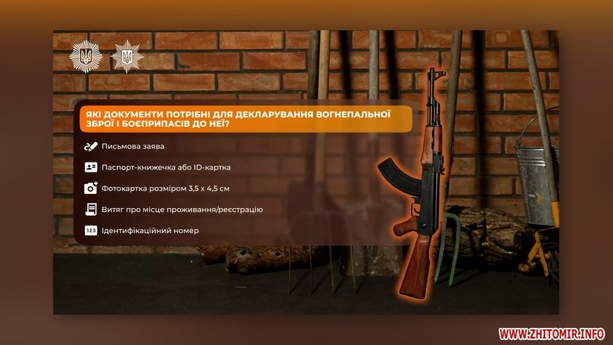 «Людина має мати з собою паспорт, ідентифікаційний код, або ID картку й виписку з демографічного реєстру та дві фотокартки. Пишеться відповідна заява щодо процедури на декларування і ми перевіряємо зброю по відповідних обліках, записуємо її у базу даних та фотографуємо. Після цього зброя повертається й даються відповідні документи», – говорить начальник сектору контролю за обігом зброї ГУНП в Житомирській області.