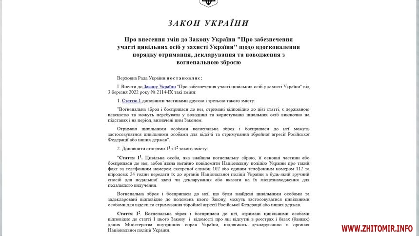 Як повідомляв Житомир.info, 25 листопада 2024 року вступив у дію Закон України «Про забезпечення участі цивільних осіб у захисті України». Відповідно до нього передбачено механізм декларування наявної у громадян вогнепальної зброї.
