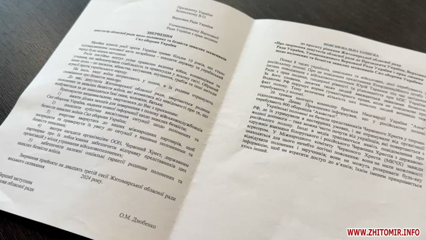 26 грудня на черговій сесії Житомирської обласної ради депутати голосували за звернення до президента України, Верховної Ради та Уповноваженого Верховної Ради України з прав людини щодо полонених та безвісти зниклих захисників Сил оборони України.