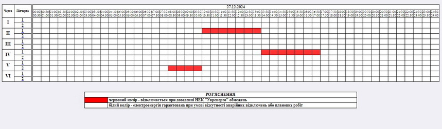 Згідно з розпорядженням НЕК «Укренерго», час застосування і обсяг обмежень на Житомирщині 27 грудня будуть такими: