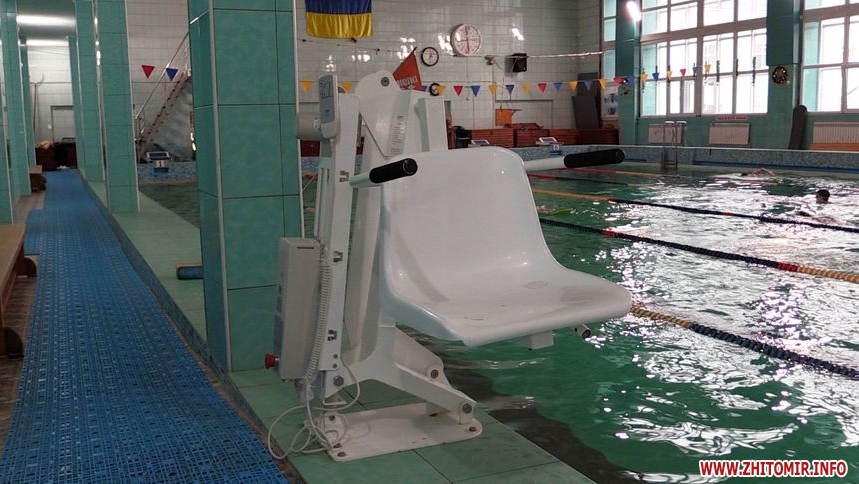 «Житомирською військовою обласною адміністрацією були виділені кошти на придбання підйомника для поранених, людей з інвалідністю, які не можуть спуститися у воду. Регулярно користуємося ним, бо у нас щоденно тренування з такими спортсменами», – розповідає президент спортивного клубу «Житомир Аква Мастерс» Ігор Кухарєв.