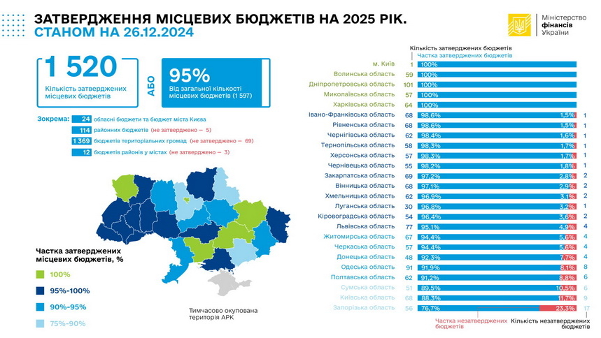 Водночас Міністерство фінансів інформує, що станом на 26 грудня 2024 року наявна інформація щодо затвердження 1520 бюджетів, що становить 95% від їх загальної кількості (1597).