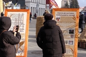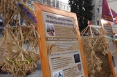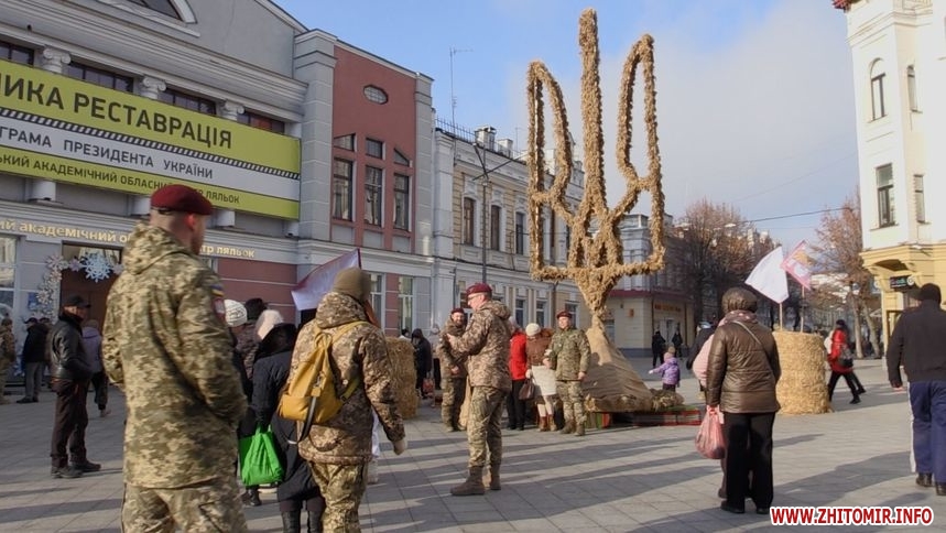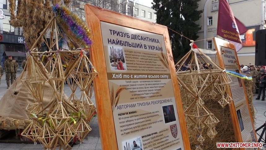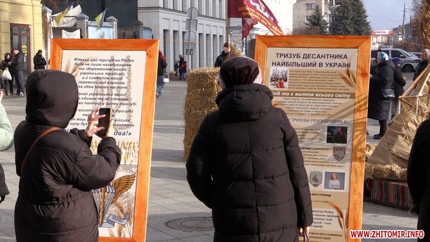 «Ми представляємо тризуб-рекордсмен, він внесений до Книги рекордів України, як найбільший тризуб з дідухів. Він сплетений з трьох сортів зерна: жита, пшениці й вівса. Важливо, що він сплетений руками поранених десантників. Наші поранені хлопці дуже класно долучилися, ми це робили влітку, мали про що поговорити, що згадати, це був приємний процес. Ми презентували тризуб 23 грудня у Львові й сьогодні презентуємо в Житомирі. 2 січня ми його демонтуємо, тому 30, 31, 1 приходьте», – каже керівниця ветеранської організації «Об’єднання Добровольців» Олена Живко.