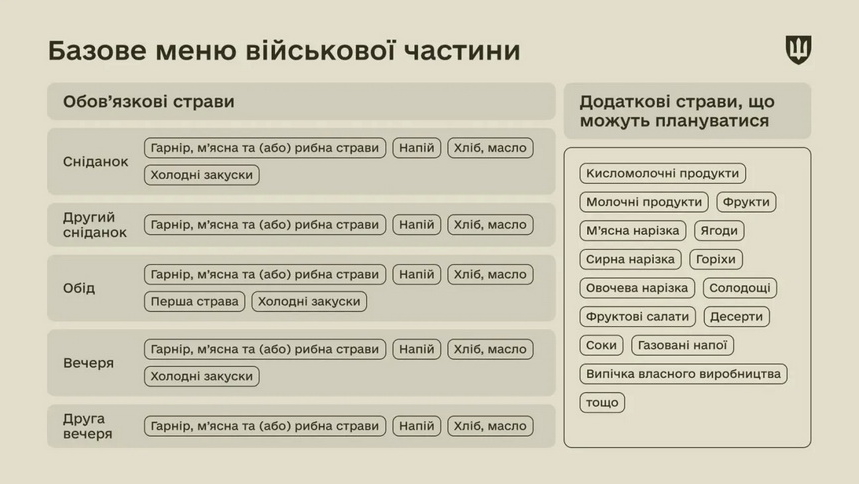 Триразове харчування передбачає сніданок, обід і вечерю. Також додатково готується друга вечеря для військовослужбовців, які несуть варту.