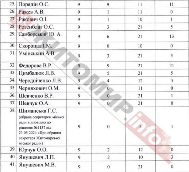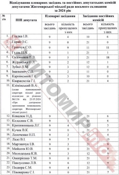 Нагадаємо, у 2023 році було 14 пленарних засідань сесій Житомирської міської ради, на жодному не були Олександр Порядін, Вікторія Федорова та Олексій Харченко, більш ніж половину пропустили Сергій Гринчук (13), Олена Юрчук (10), Лариса Павлусенко (9), Вадим Ліскі (8), Лідія Чередніченко (8). Лише шість депутатів у 2023 році не пропустили жодного пленарного засідання: Олег Горай, Оксана Журавська, Сергій Колесник, Іван Мартинчук, Тетяна Онопрієнко, Олександр Шевчук.