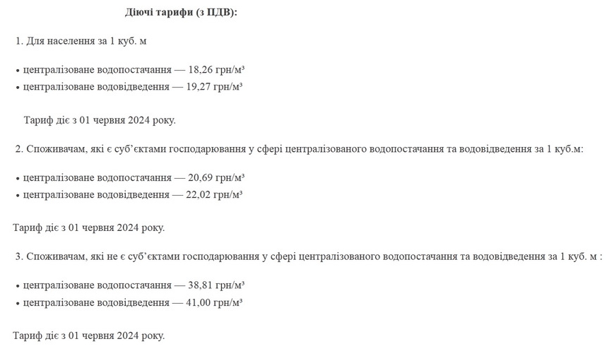 Нагадаємо, у Житомирі з 1 січня 2022 року зросли тарифи на водопостачання та водовідведення і вони були однакові для всіх категорій споживачів: 37,53 грн за 1 куб.м. НКРЕКП з 1 червня 2024 року змінила тарифи на водопостачання та водовідведення для непобутових споживачів низки водоканалів, зокрема, у Житомирі вартості 1 куб.м води зросла більш ніж у два рази.