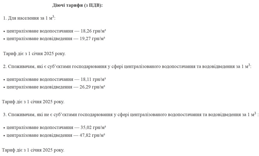 Зазначено, що тарифи затверджені постановою Національної комісії, що здійснює державне регулювання у сферах енергетики та комунальних послуг (НКРЕКП), від 24 грудня 2024 року, зміни не стосуються населення, для юридичних осіб – підвищення на 3%.