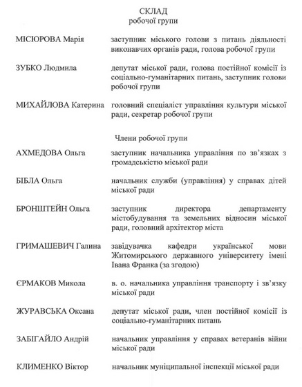 Всього у складі групи 23 особи, крім представників підрозділів міської ради серед членів робочої групи: завідувачка кафедри української мови ЖДУ ім. Івана Франка Галина Гримашевич, начальник муніципальної інспекції Віктор Клименко, депутатки Оксана Журавська (фракція «Європейська Солідарність», директорка ліцею №4) та Олена Юрчук (фракція «Пропозиція», завідувач кафедри української та зарубіжної літератур і методик їх навчання в ЖДУ).