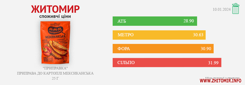 Моніторинг здійснено на основі інформації, отриманої за методом контрольної закупки 10.01.2025 р. у місцях продажу: АТБ, пр. Миру, 15 А, Фора, вул. Лятошинського, 2, Метро, вул. Ватутіна, 55-в, Сільпо, вул. Житній ринок, 1