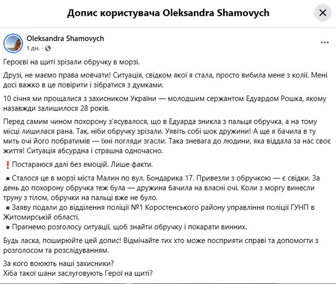 Про це 13 січня повідомляє онлайн-видання «Українська правда» в матеріалі «На Житомирщині в загиблого воїна перед похованням зникла обручка: дружина каже, її могли зрізати в морзі».